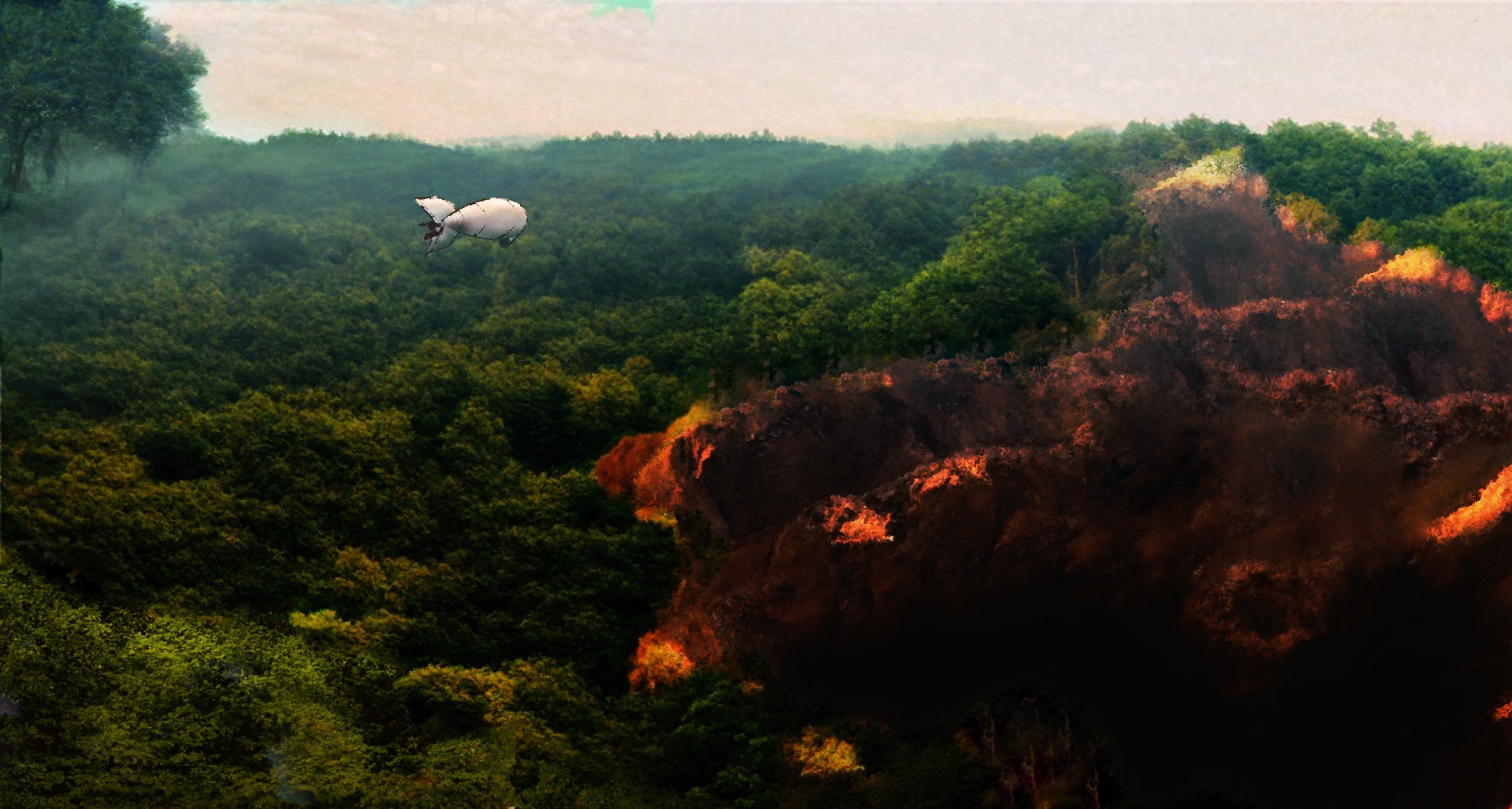 A new morning dawns. Our adventurers are sailing through dense morning fog and are reflecting on their encounters thus far. As the first beams of sunlight break through the clouds and the curtain of fog begins to lift, they find themselves hovering above untouched, living, and thriving landscapes. Massive trees standing as tall as they are flying, birds and other airborne animals filling the skies, and the forests below rich with deep greenery.