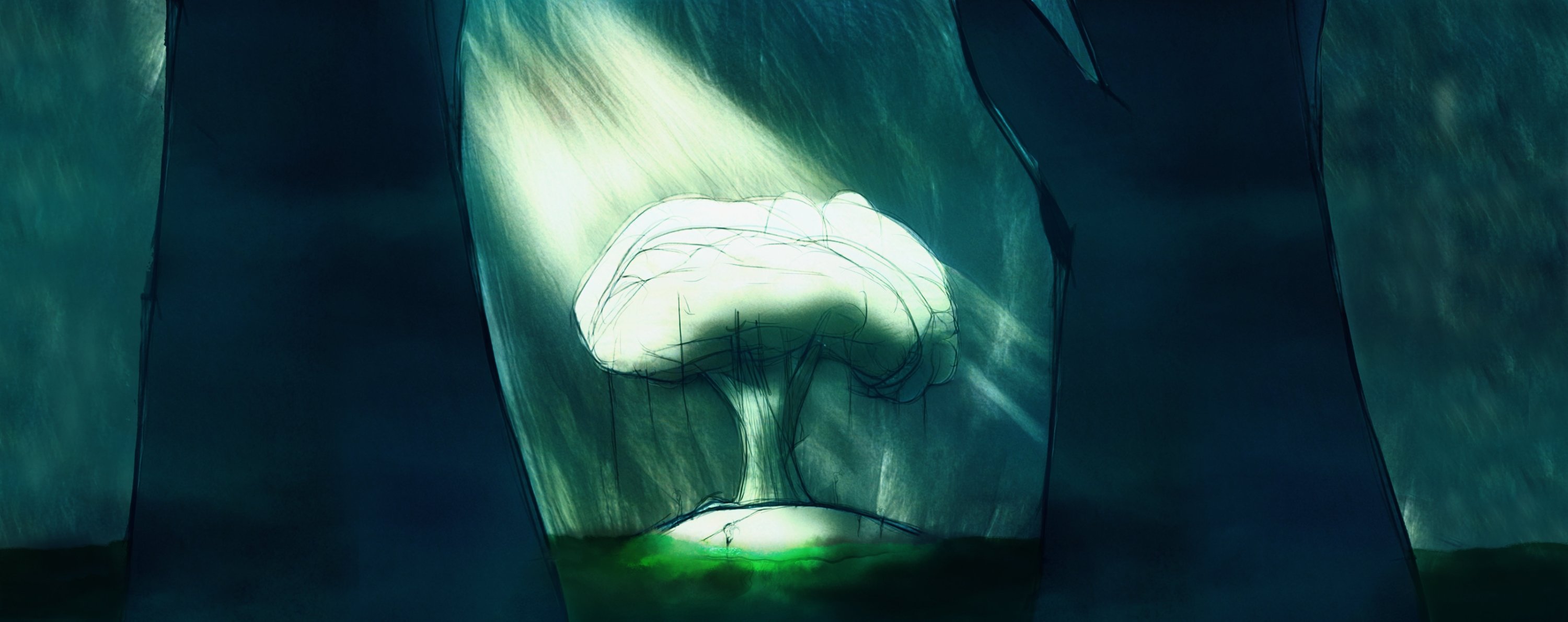 They step through a gate made of trees and find themselves at the heart of the planet. A single ancient tree growing from a small islet poking out of the water